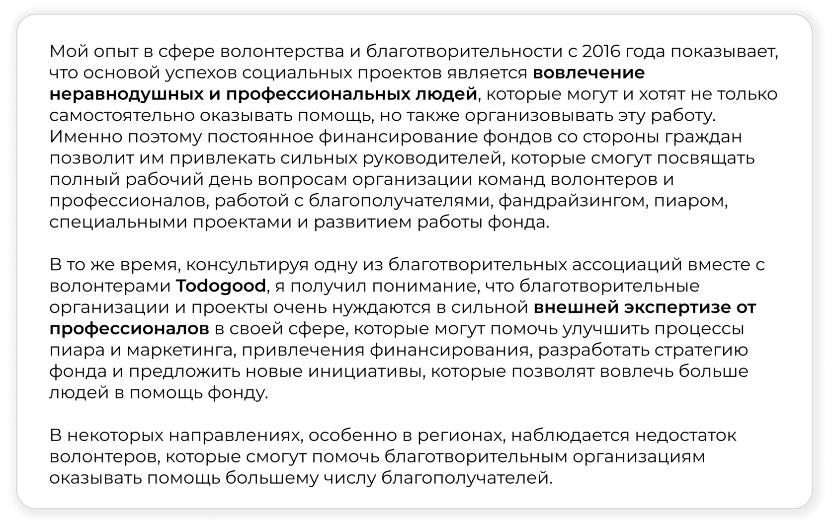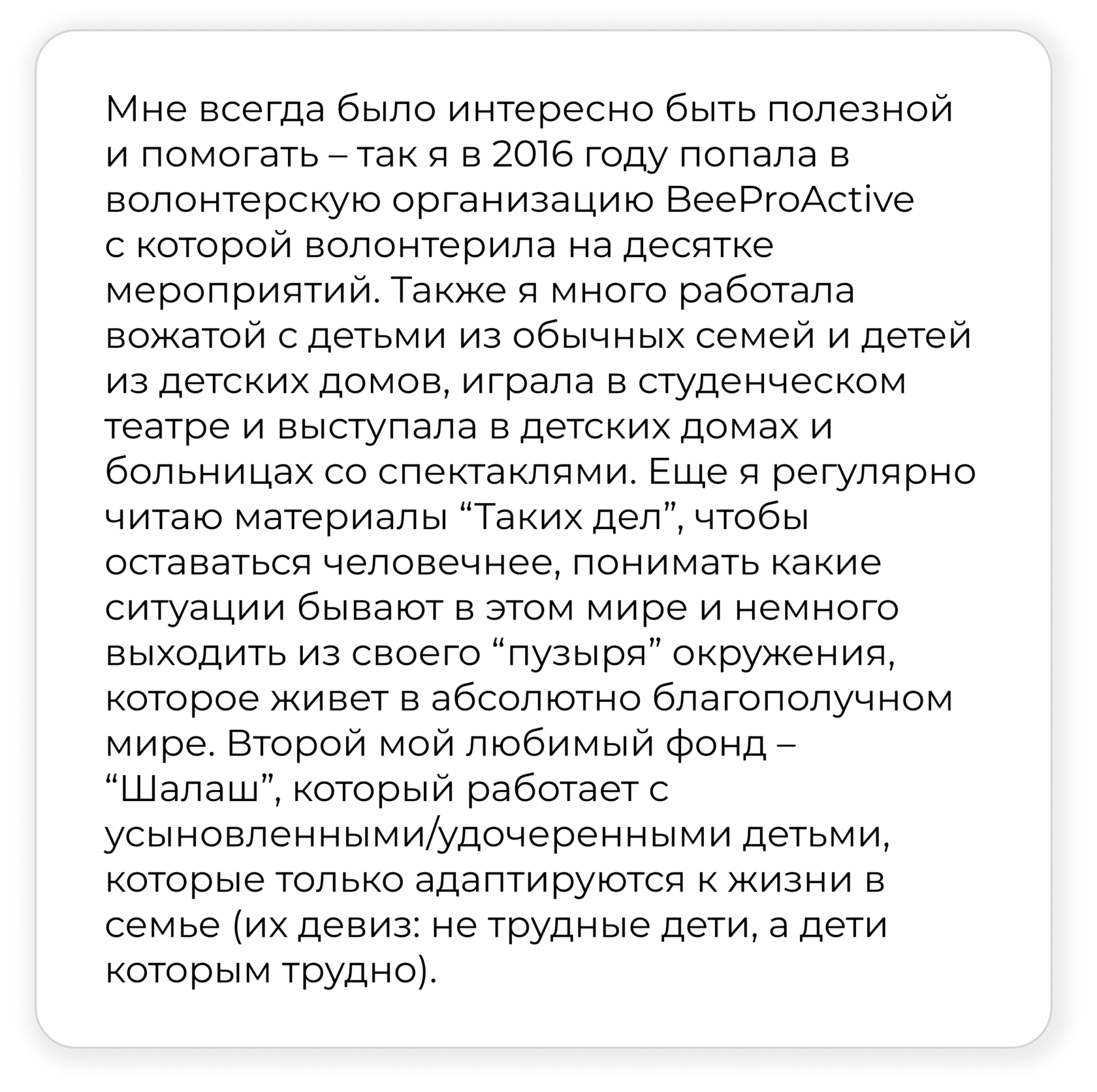 Россия – страна социальных сирот: 98% детей, оказавшихся в детском доме, имеет живых родителей или ближайших родственников. Более 5 лет я регулярно ездила в детский дом в Калужской области и видела, как абсолютно все дети в детском доме ждут и любят своих родных матерей, которые к тому же часто очень мало им дали и повредили их психику и веру в людей. Немногие из них способны выйти из кризиса и забрать родных детей домой. За 5 лет я встретила всего 2 таких женщины. Не перестаю ими восхищаться и по сей день. Но в целом это не общая практика, а, скорее, исключение. Причина тому, что женщина самостоятельно очень часто не способна преодолеть свои трудности – ей требуется разумная и систематическая помощь и поддержка. Я думаю, что такой кризисный центр – это и есть ответ на такую нужду.