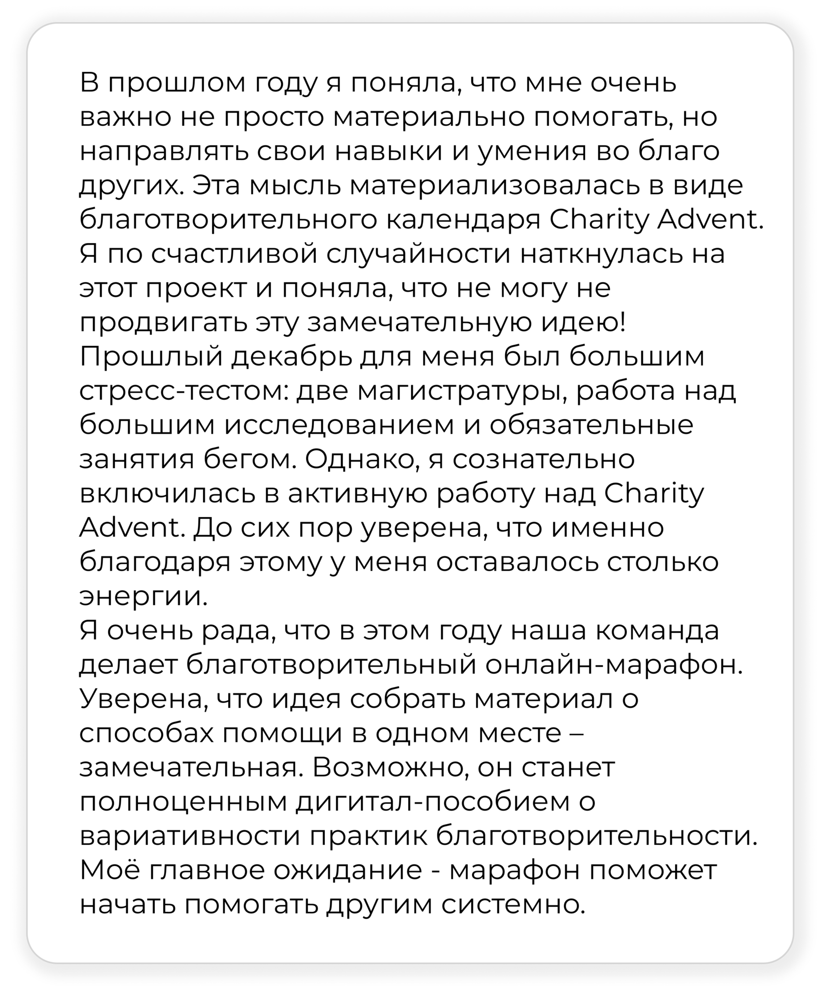 Я приехала в кризисный центр впервые год назад со своими подругами, которые как волонтеры помогали этому центру уже несколько лет. Была большая нужда в продуктах, я собрала финансы, мы закупили много еды, загрузили целый грузовик и поехали в гости к женщинам и их деткам. Мы отлично провели время: вместе готовили, общались, играли с детьми. Выяснилось, что центр не имеет никакой помощи со стороны государства и что он существует только на добровольные пожертвования людей. Именно поэтому курица, запеченная в духовке, оказалась большим деликатесом, ведь рацион в обычные дни там достаточно простой, а мясо бывает всего несколько раз в неделю.